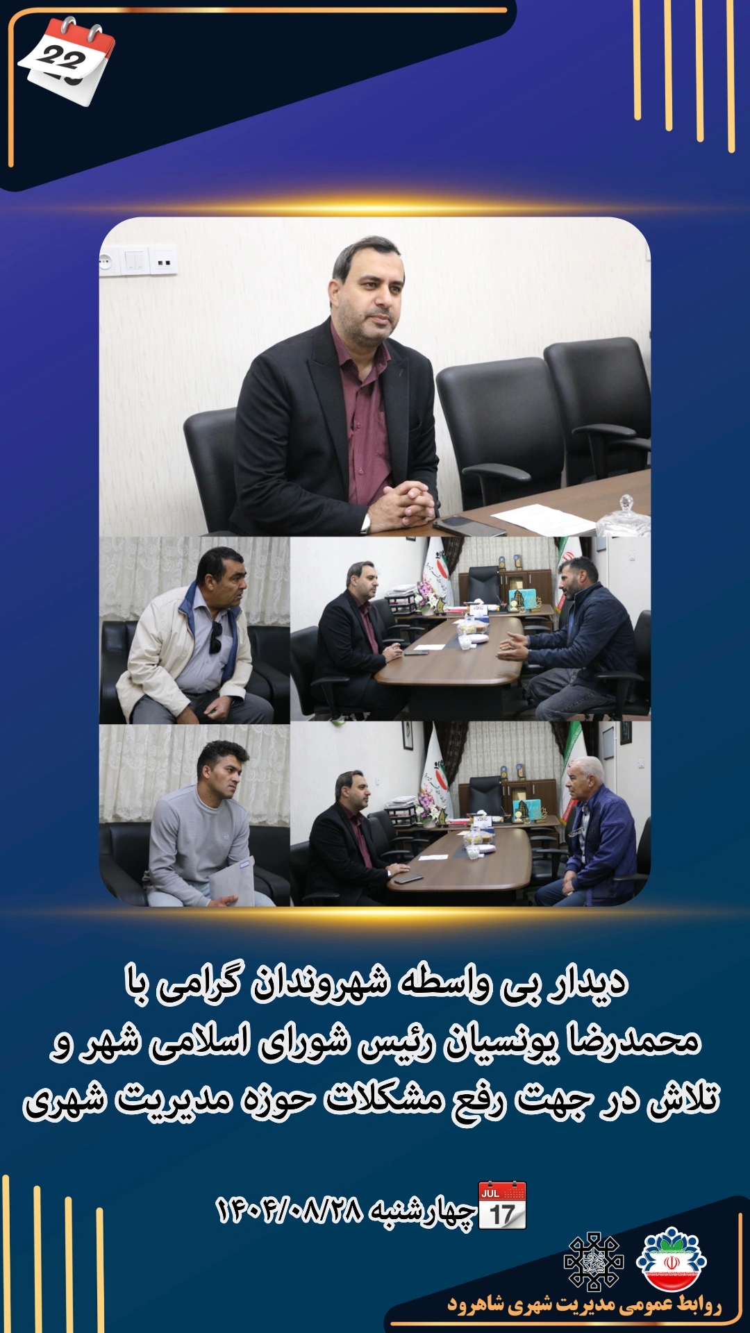 دیدار بی واسطه شهروندان گرامی با محمدرضا یونسیان رئیس شورای اسلامی شهر و تلاش در جهت رفع مشکلات حوزه مدیریت شهری 📆چهارشنبه ۱۴۰۴/۰۸/۲۸ 🎙روابط عمومی مدیریت شهری شاهرود