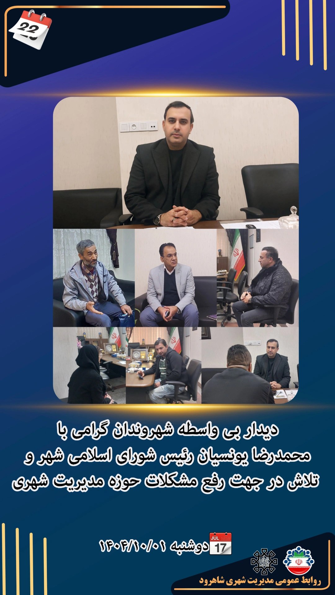 دیدار بی واسطه شهروندان گرامی با محمدرضا یونسیان رئیس شورای اسلامی شهر و تلاش در جهت رفع مشکلات حوزه مدیریت شهری 📆 دوشنبه ۱۴۰۴/۱۰/۰۱ 🎙روابط عمومی مدیریت شهری شاهرود