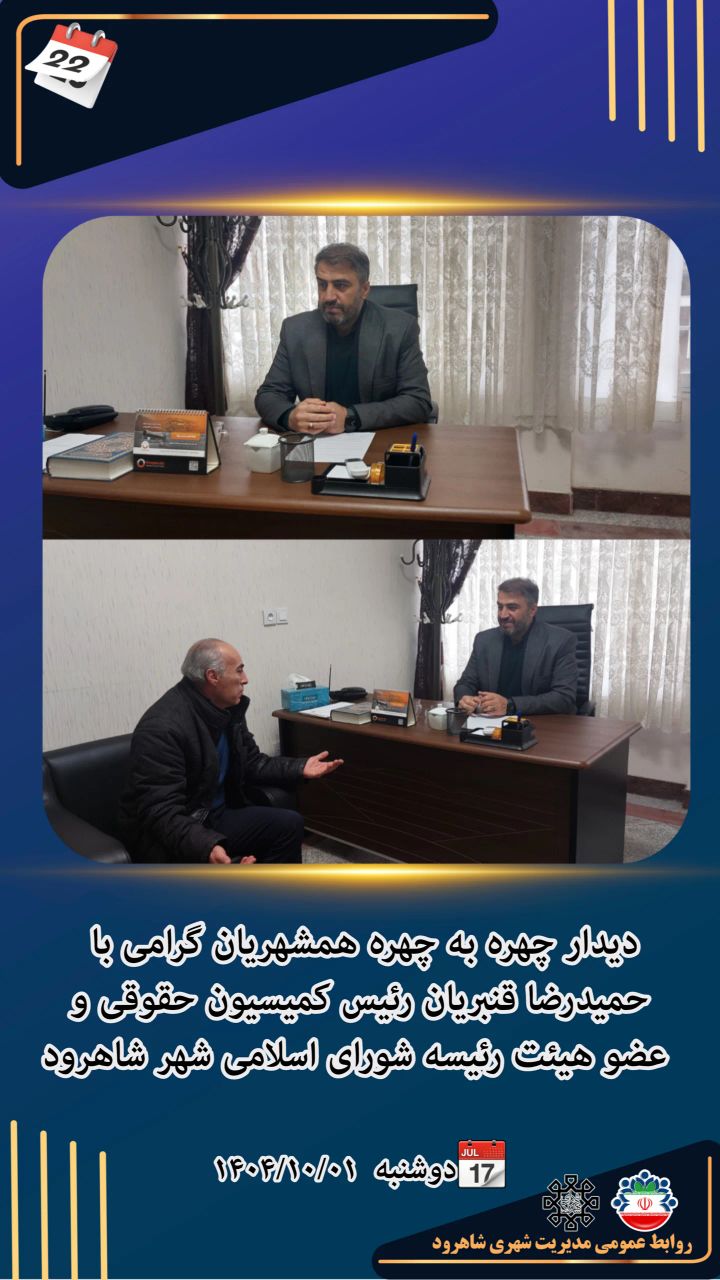 دیدار چهره به چهره همشهریان گرامی با حمیدرضا قنبریان رئیس کمیسیون حقوقی و عضو هیئت رئیسه شورای اسلامی شهر شاهرود 📆دوشنبه ۱۴۰۴/۱۰/۰۱ 🎙روابط عمومی مدیریت شهری شاهرود