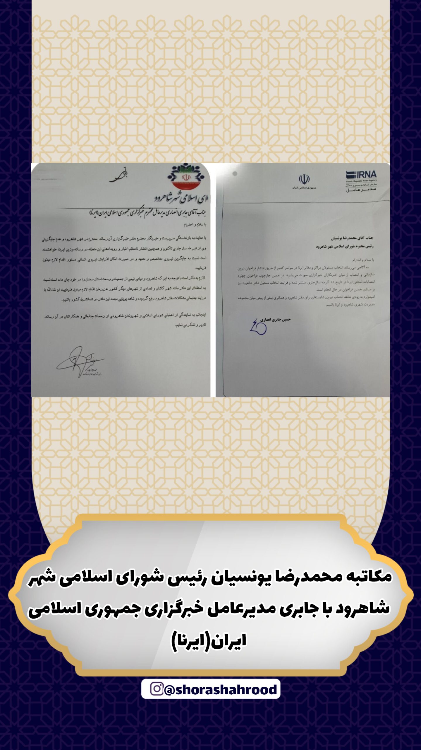 بدنبال مکاتبه محمدرضا یونسیان رئیس شورای اسلامی شهر شاهرود با جابری مدیرعامل خبرگزاری جمهوری اسلامی ایران(ایرنا) در خصوص جایگزینی نیروی متخصص و متعهد، افزایش نیروی انسانی دفتر این خبرگزاری در شاهرود و استقلال آن جوابیه ای از سوی وی به شورای اسلامی ارسال گردید