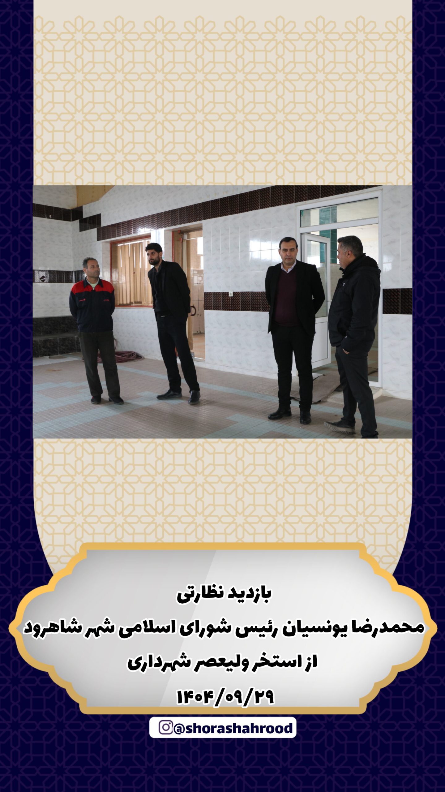 https://shora.shahrood.ir/wp-content/uploads/2025/12/VID_20251221_124508_553-1.mp4 بازدید نظارتی محمدرضا یونسیان رئیس شورای اسلامی شهر شاهرود از استخر ولیعصر شهرداری باتوجه به تعطیلی یک ماه استخر ولیعصر شهرداری با هدف مرمت و کف سازی محیط استخر…