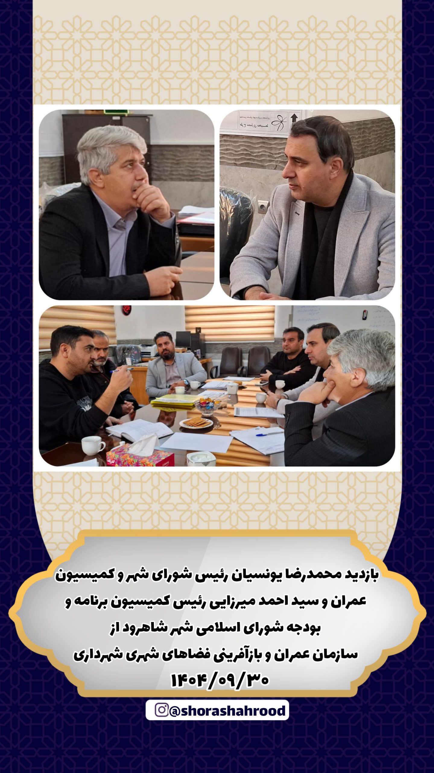 حضور محمدرضا یونسیان رئیس شورای شهر و کميسيون عمران و سید احمد میرزایی رئیس کمیسیون برنامه و بودجه شورای اسلامی شهر شاهرود با هدف نظارت و بازرسی در سازمان عمران و بازآفرینی فضاهای شهری شهرداری شاهرود
